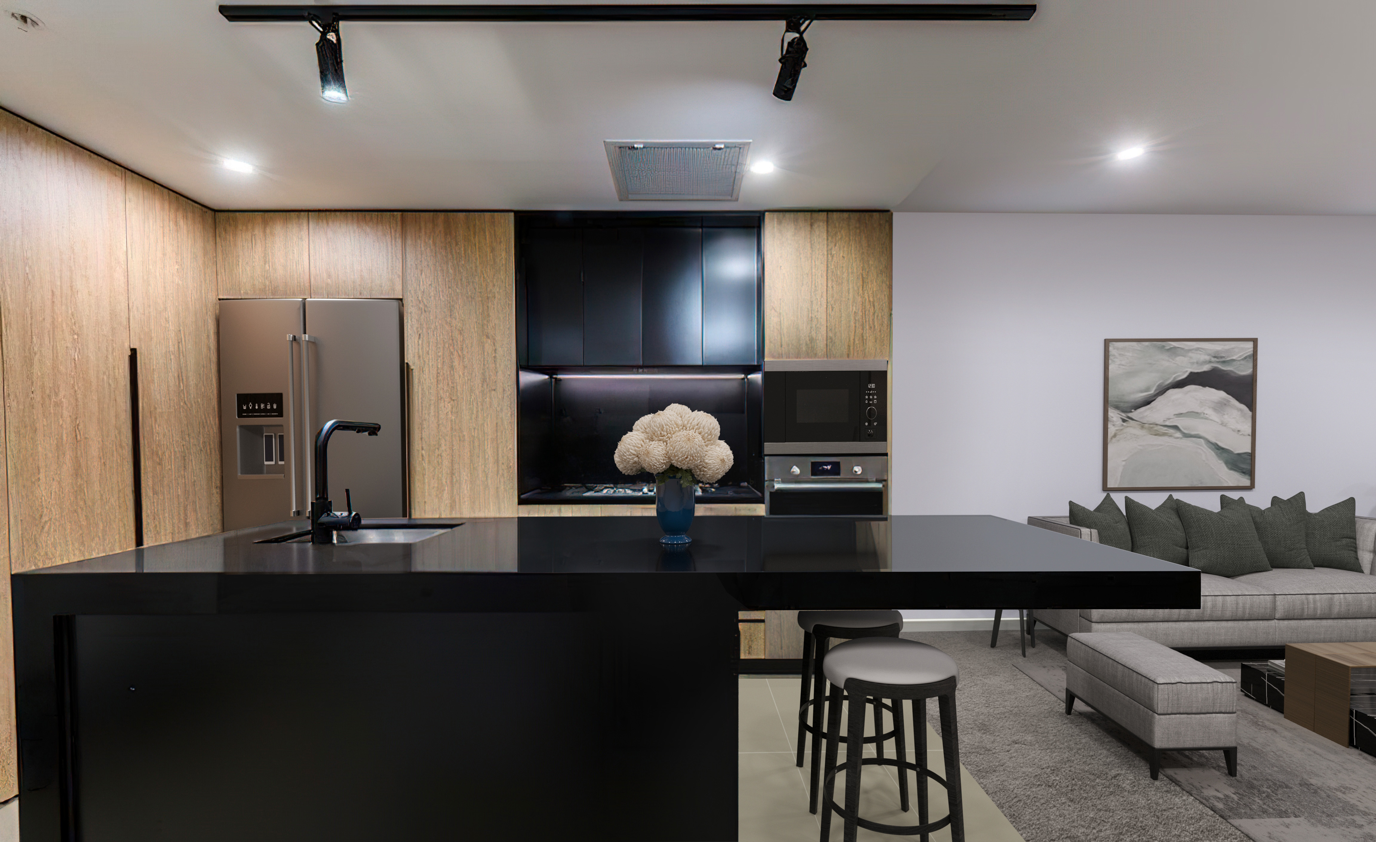 - Contemporary kitchen with stone bench tops, gas cooking, integrated dishwasher