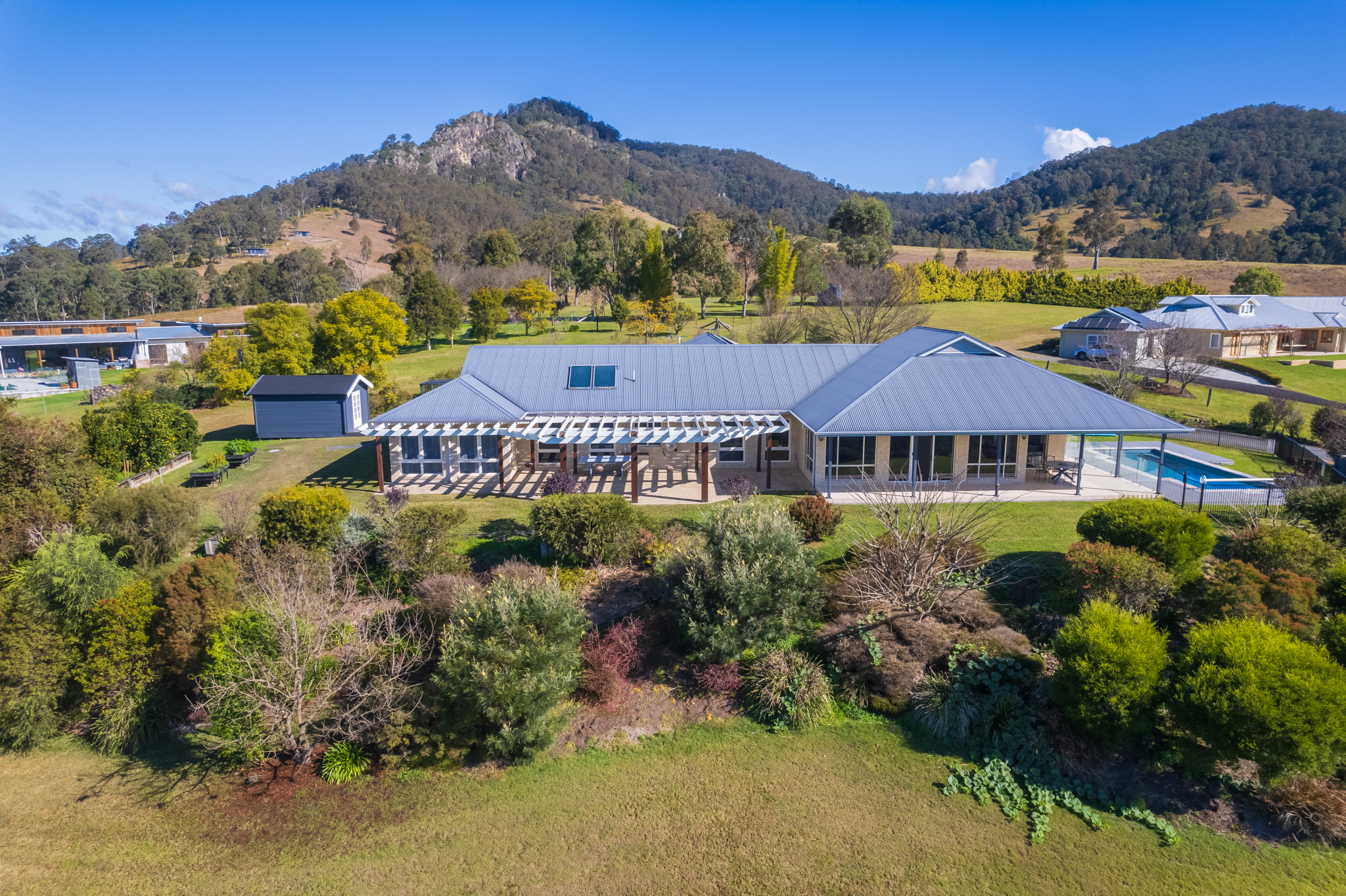 Upon arrival, the breathtaking location immediately captivates. Perched with a perfect north-east orientation, the home provides panoramic mountain views that stretch across Gloucester. The generous floorplan includes light-filled, open-plan living spaces designed to embrace the views, with floor-to-ceiling windows in the lounge and dining rooms that open onto a spacious outdoor living area, ideal for entertaining. Here, you'll find a large pergola, an inground self-cleaning swimming pool with ambient night lighting, and plenty of space to relax while taking in the spectacular backdrop.
