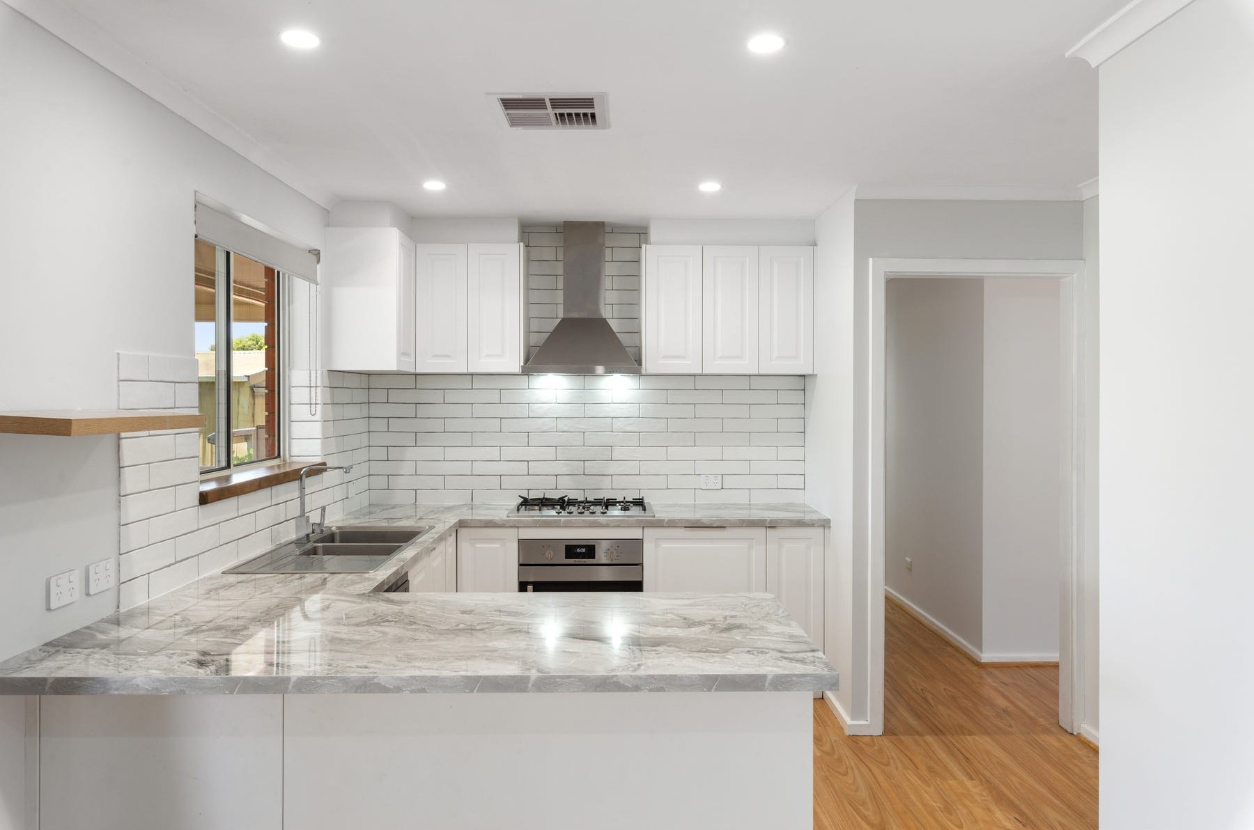 - Kitchen: Gas cooktop, electric oven, dishwasher, ample bench and cupboard space