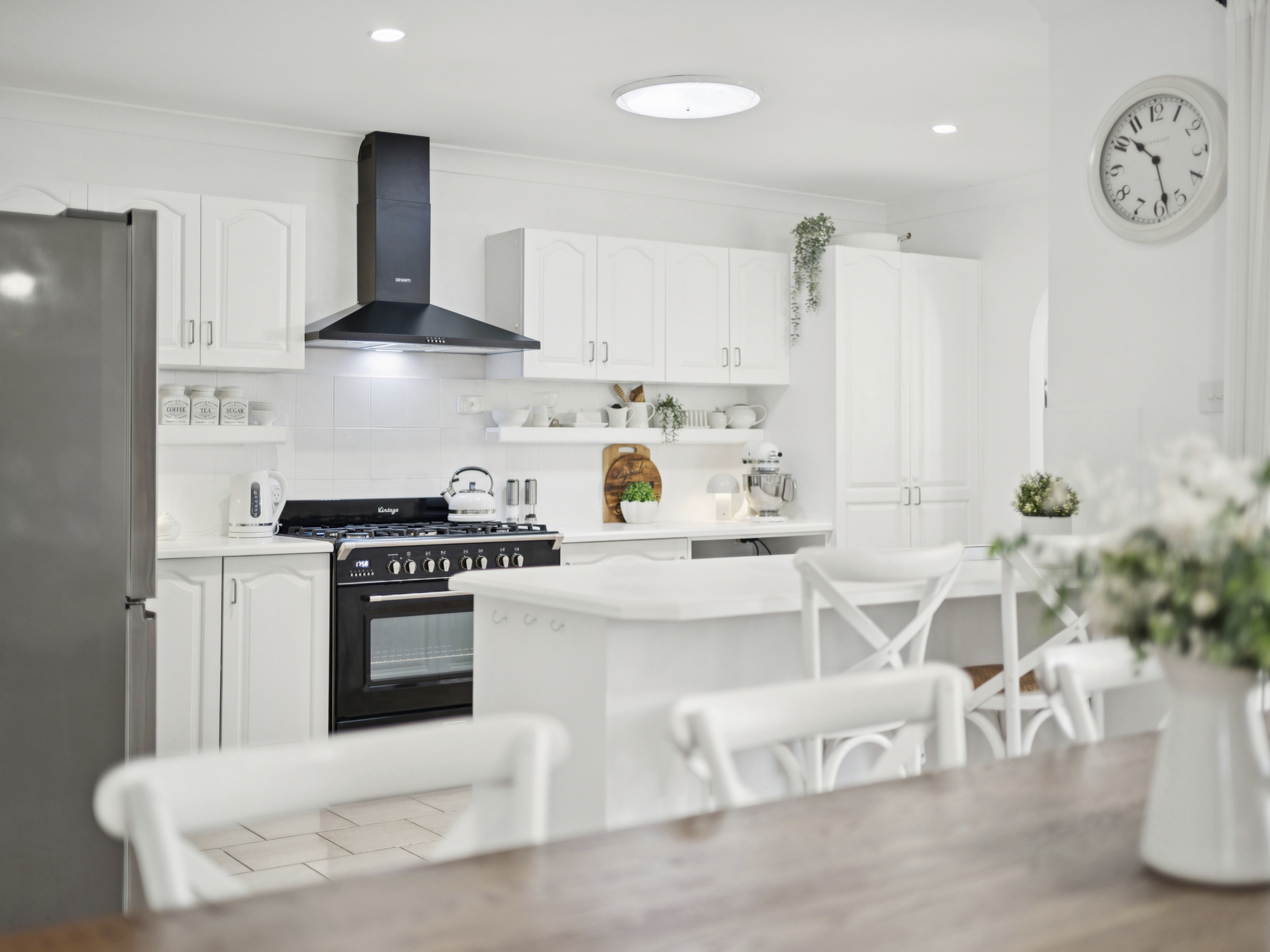 * White Hamptons-style kitchen with 900mm cooker & dishwasher