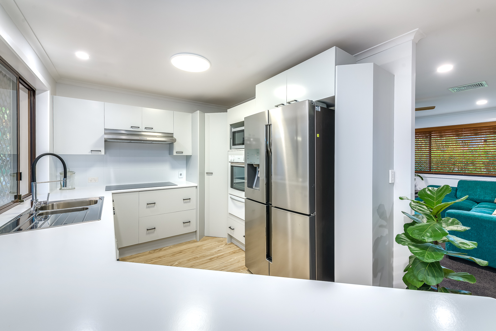 * Living room adjoining sun-drenched dining & kitchen opening outdoors