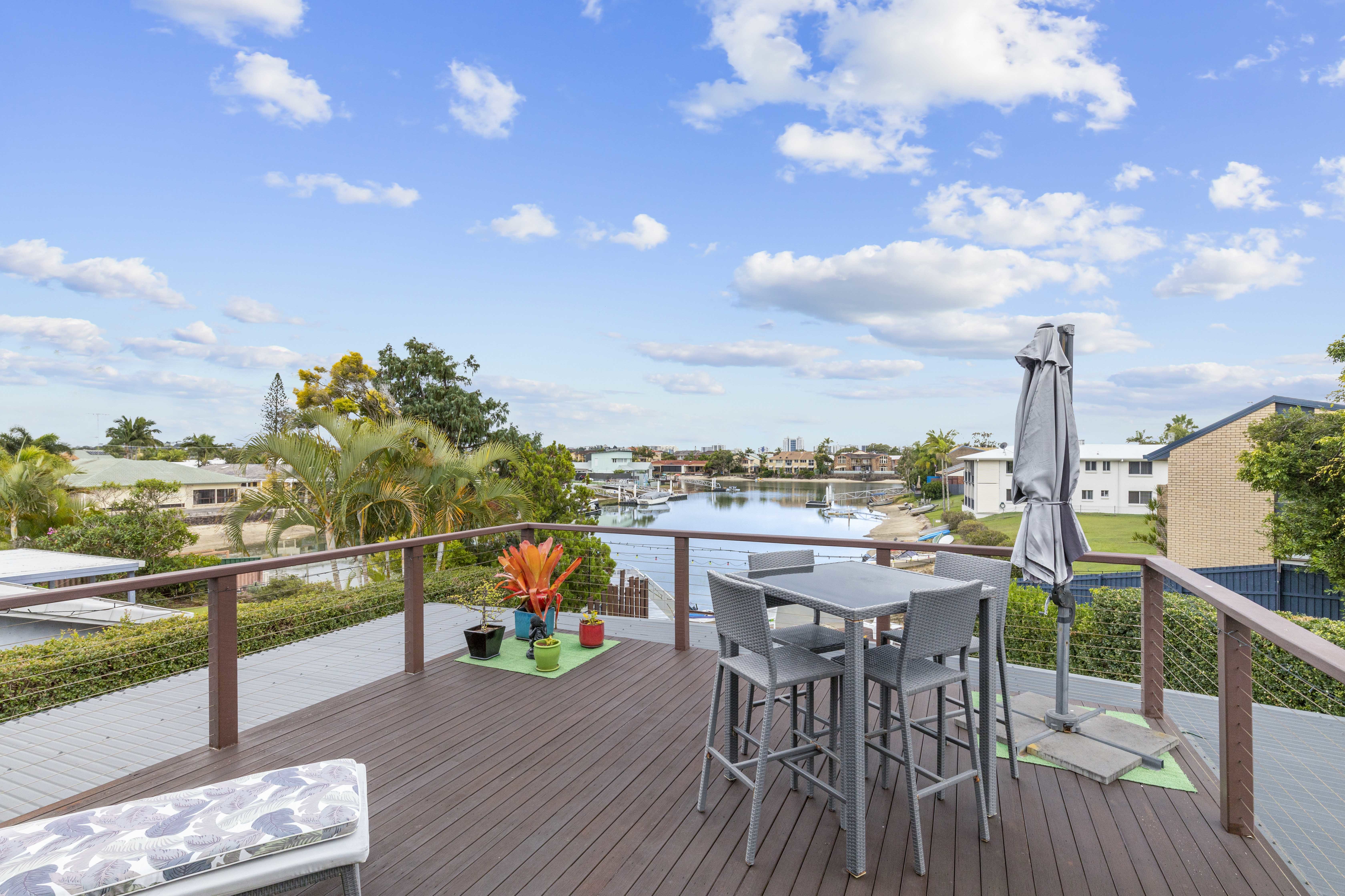 The beautiful timber deck at the bottom of the yard is the perfect space for sundowners and provides access to your own canal front white sandy beach - perfect for kayaking, stand-up paddle boarding or just a refreshing swim.